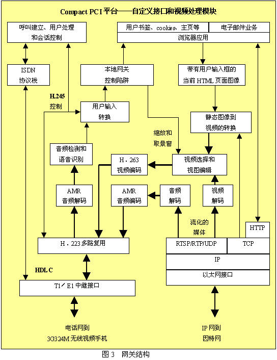 圖3所示為網(wǎng)關(guān)重要組成的分解圖。網(wǎng)關(guān)機(jī)箱很可能是一個Compact PCI機(jī)箱,機(jī)箱中包含了作為網(wǎng)絡(luò)中一個節(jié)點(diǎn)的所有組件;镜囊曨l呼叫和瀏覽器應(yīng)用可以運(yùn)行在主處理器上,但T1或E1接口需要由附加模塊來支持。為了支持大量的端口,還需要附加的以太網(wǎng)接口和自定義的視頻處理模塊。T1/E1接口通過公共電話網(wǎng)接入無線交換中心,也可以直接接入到無線交換中心。以太網(wǎng)接口會通過標(biāo)準(zhǔn)IP路由器接入到因特網(wǎng)。