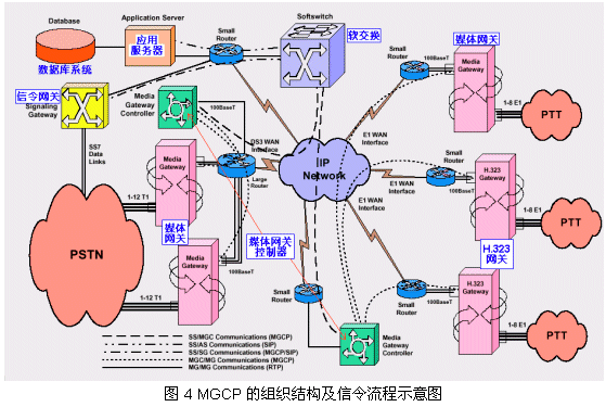 下面的圖4給出了MGCP協(xié)議體系中的邏輯組件、組織結構和信令流圖。