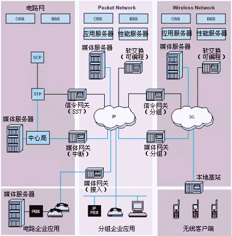 呼叫控制應(yīng)用包括IP電話網(wǎng)關(guān),基于軟交換的骨干網(wǎng),以及業(yè)務(wù)平臺,比如大型語音門戶和語音郵件系統(tǒng)。信令網(wǎng)關(guān)也是移動網(wǎng)絡(luò)的一部分,動網(wǎng)絡(luò)包括歸屬位置寄存器和短消息中心。引入2.5代和3代移動業(yè)務(wù)時,也需要SS7/IP互通,因此,也需要信令網(wǎng)關(guān)。智能網(wǎng)業(yè)務(wù)節(jié)點提供的業(yè)務(wù),比如對方付費電話、語音提示等都可以通過使用信令網(wǎng)關(guān)而采用能低成本的ip體系結(jié)構(gòu)。