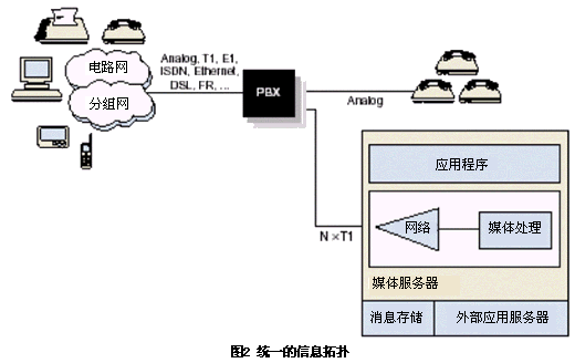 圖2是有前提的典型統(tǒng)一消息拓?fù)鋱D。這個例子中媒體服務(wù)器管理消息的存儲和提取,這些消息包括語音、傳真、數(shù)據(jù)或視頻。它可以訪問不同媒體文件以及必要的控制規(guī)則以實現(xiàn)各類媒體業(yè)務(wù)。可以在本地的媒體服務(wù)器上也可以在遠程的集中存儲系統(tǒng)上進行存儲。在這種情況下,能提供語音和傳真資源的統(tǒng)一的消息系統(tǒng)通常和email系統(tǒng)比如微軟的Microsoft