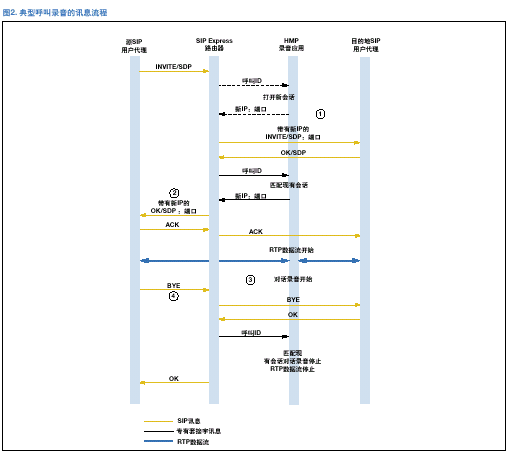 圖2是"代理RTP"在線錄音系統(tǒng)典型呼叫錄音的訊息流程圖解。圖中數(shù)字對應(yīng)于下文的段落編號。