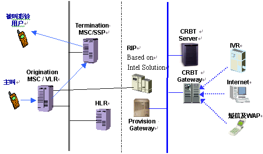 。。RIP 是CRBT系統(tǒng)的信令接續(xù)、語音處理單元。它與MSC以ISUP或TUP信令對接,負責接聽、應(yīng)答來自MSC的來話并建立語音通道,將來話的隨路信息主叫、被叫、原被叫等發(fā)往CRBT Server,并播放由CRBT Server指定的回鈴音。