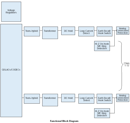 來自12個(gè)環(huán)路電話線的信號(hào)首先通過電話線路接口連接到D/120JCT-LS板卡上,該接口提供瞬變保護(hù)和電磁干擾(EMI)刪除(參見子板塊圖)。這些電話線路接口使用可靠的晶體摘掛機(jī)開關(guān)(無機(jī)械接觸)和FCC-Part 68 A類振鈴電壓和B類振鈴頻率電路。這種FCC支持的振鈴檢測(cè)器對(duì)于網(wǎng)絡(luò)上隨機(jī)電壓浮動(dòng)產(chǎn)生的虛假振鈴不敏感,每一接口都具有高壓尖峰信號(hào)保護(hù)和不利網(wǎng)絡(luò)條件保護(hù)的集成電路,允許應(yīng)用程序可以在振鈴過程中任何時(shí)候摘機(jī)而不會(huì)損壞板卡。