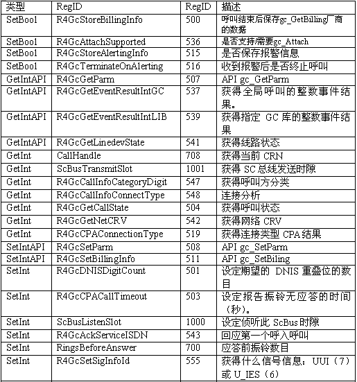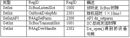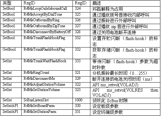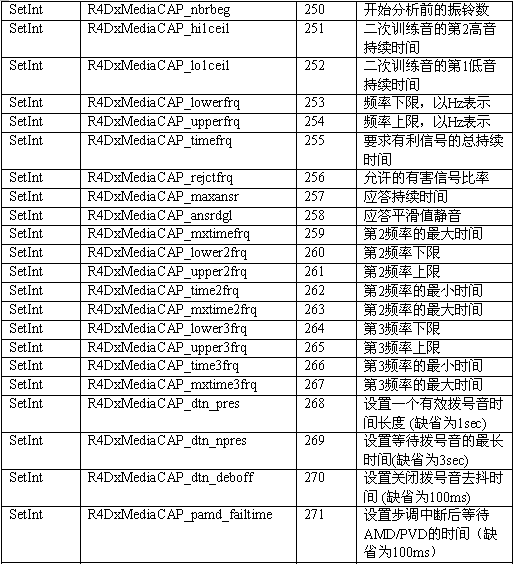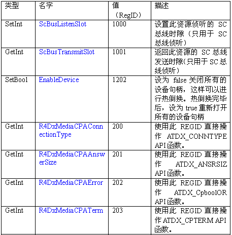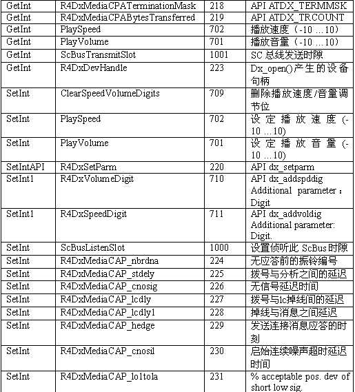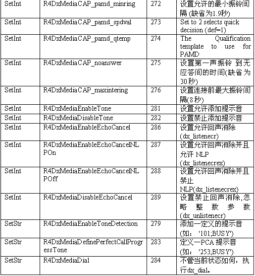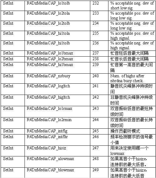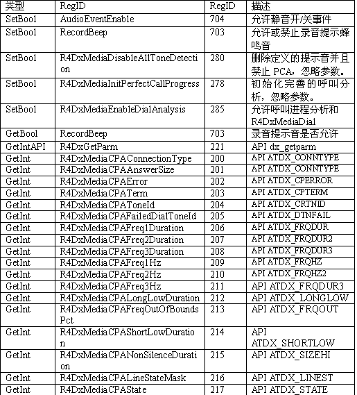 必須注意,調用API級的函數設置一個CTADE_A參數可能不只改變電路板級的參數。例如,R4DxMedia中,使用函數MediaSetBool設置REGID_R4DxMediaDisableAllToneDetection(280)為0或1來清除Dialogic提示音ID。
