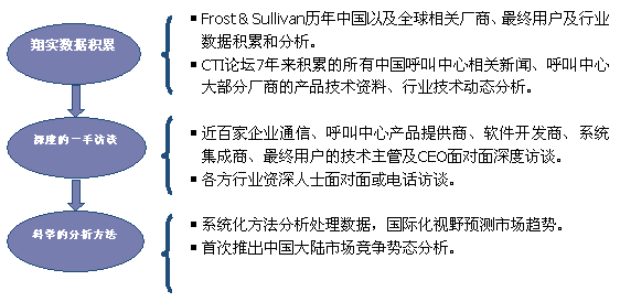 Frost & Sullivan 和 CTI論壇(m.skybaby168.com)共同組成的調(diào)研小組,在查閱了大量資料的基礎(chǔ)之上,以企業(yè)通信及呼叫中心的設(shè)備應(yīng)用、投資計(jì)劃以及相關(guān)廠商的市場表現(xiàn)為出發(fā)點(diǎn),通過對企業(yè)通信及呼叫中心重要應(yīng)用企業(yè)、在市場占主導(dǎo)地位的二十多家設(shè)備廠商、二十多家軟件開發(fā)商、十幾家系統(tǒng)集成商、數(shù)家外包運(yùn)營商的深度訪談,參閱內(nèi)部相關(guān)報(bào)告及數(shù)據(jù)庫,對數(shù)據(jù)的來源和數(shù)據(jù)的準(zhǔn)確性進(jìn)行了詳細(xì)核對與論證;憑借參與調(diào)研人員的多年從業(yè)經(jīng)